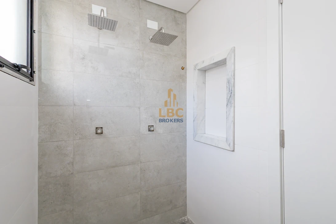 Banheiro da suíte com bancada, 2 cubas, 2 chuveiros estilo ducha na área de banho.
